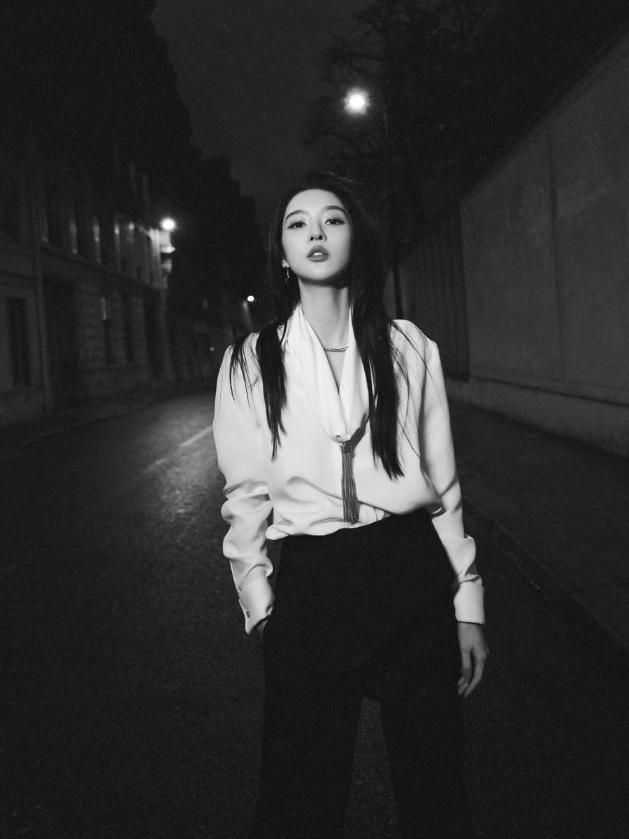 隧道作为此次大片的拍摄场景,无疑是氛围感营造的核心,与王玉雯的黑白造型完美契合,打造出了极具故事感的画面。昏暗的隧道背景,没有多余的杂物干扰,让视线完全聚焦在王玉雯身上,两侧微弱的光线,形成了明暗交错的光影效果,为整个画面增添了一丝神秘与高级感。光线从隧道尽头洒落,在她的身上形成柔和的光晕,既凸显了白衬衫的干净纯粹,又展现了黑毛绒披肩的细腻质感,黑白撞色在光影的映衬下,更具视觉冲击力,让整个造型既有冷艳感,又有温柔感,一冷一暖之间,氛围感瞬间拉满。