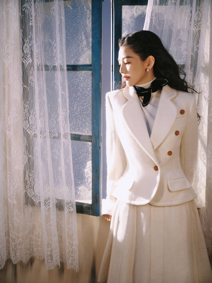 白色制服的色调与场景的暖光相互呼应,进一步放大了氛围感。白色的色调纯净通透,自带温柔滤镜,与暖光的柔和相互融合,让整个画面看起来温暖又治愈,既凸显了旧时光里的温婉格调,又增添了一丝灵动,与章若楠的气质完美契合。不同于深色制服的沉闷,白色制服更具轻盈感,搭配章若楠灵动的姿态,让整个造型看起来更加鲜活,没有旧时光造型的厚重感,反而多了几分少女的灵动与活泼。