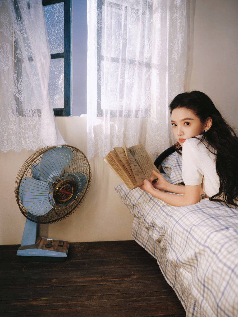 章若楠的镜头表现力更是超强,每一个表情、每一个动作都精准拿捏,将双重人设的氛围感展现得入木三分。她没有刻意摆拍,而是以最自然的状态面对镜头,时而低头浅笑,温柔温婉;时而抬眸望镜,眼神灵动;时而对镜wink,俏皮活泼,每一个动作都自然舒展,每一个表情都极具故事感,让整个画面充满了氛围感与感染力,仿佛在诉说着一段旧时光里的少女心事。