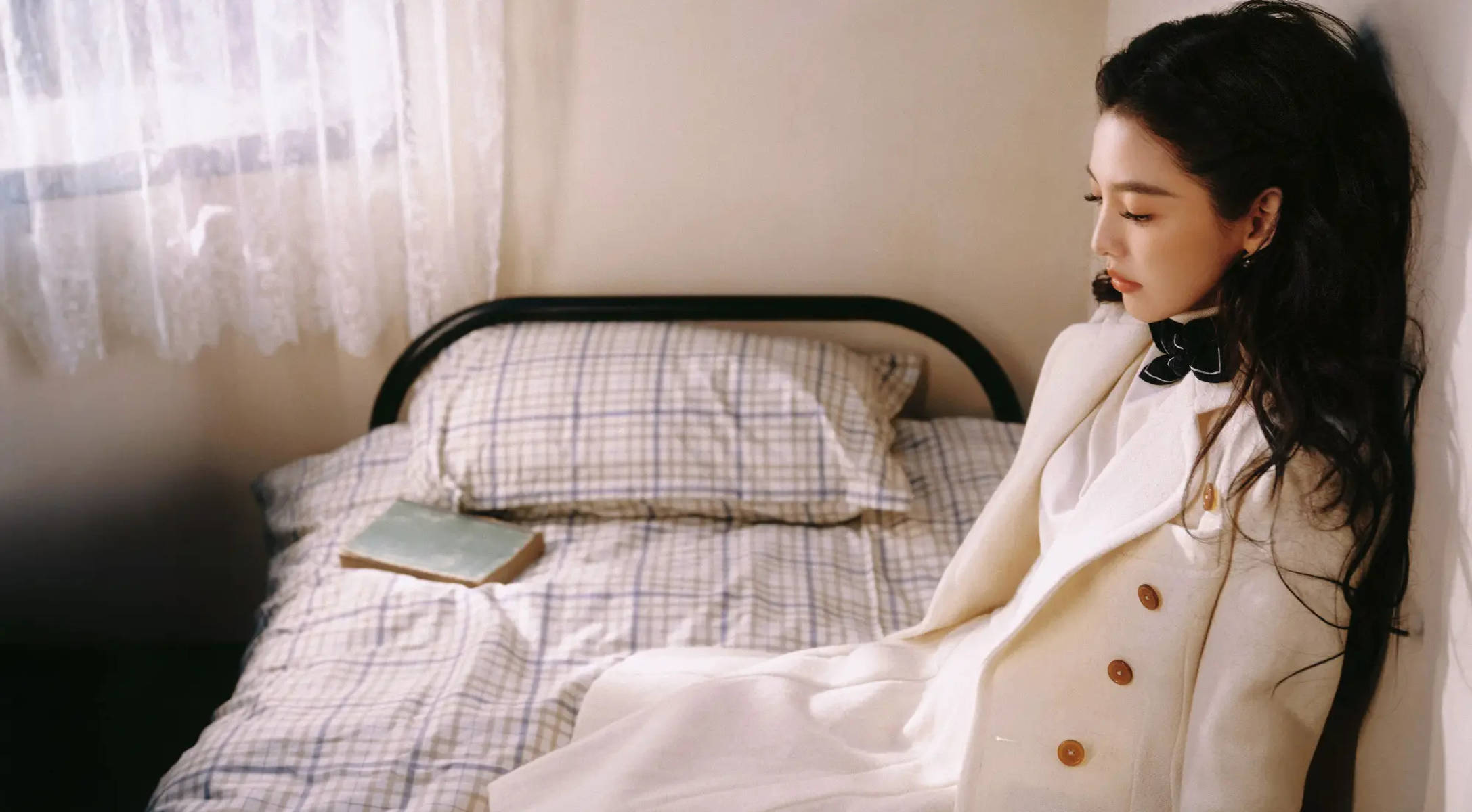 妆造搭配与场景、制服高度契合,进一步放大了氛围感。妆容上,清透自然的裸系淡妆,与暖光、白色制服相互呼应,让章若楠的五官看起来更加精致立体,眉眼间的温柔与灵动完美展现,既符合旧时光少女的温婉,又适配傲娇千金的俏皮。发型上,乌黑的长发随意散落肩头,发尾微微内扣,增添一丝温柔慵懒,没有多余的发饰装饰,仅用发丝的纹理感修饰脸型,让整个造型更具自然感,与旧时光的氛围感完美融合。